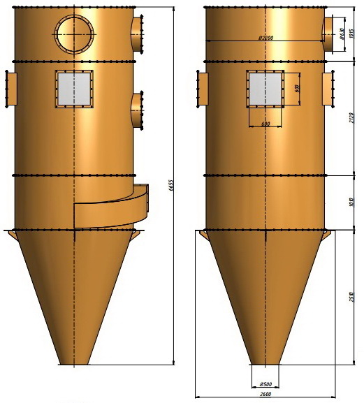 - Циклонный вход под углом 11° обеспечивает лучшую сепарацию мелкой пыли и